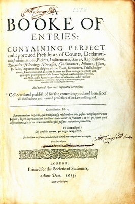 Coke, Sir Edward. A Booke of Entries: Containing Perfect and Approved Presidents of Counts, Declarations, Informations, Pleints, Inditements, Barres, Replications, Reioynders, Pleadings, Processes, Continuances, Essoines, Issues, ... [etc.]. 1st ed. London: Printed for the Societie of Stationers, 1614. Private collection.
